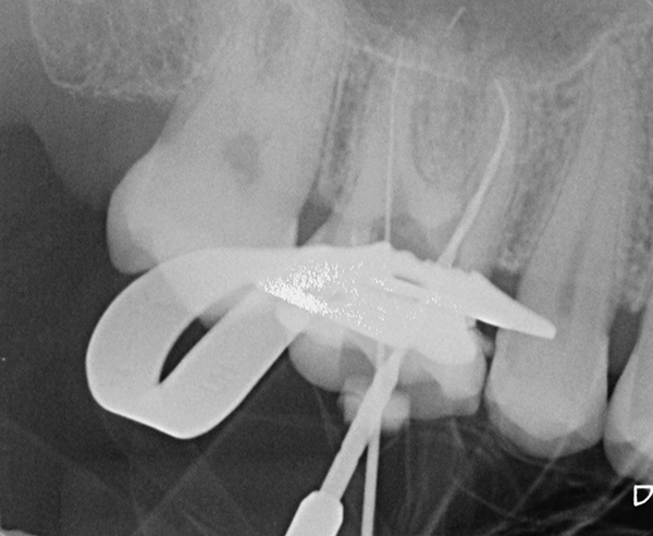 Die Patientin wurde zu uns überwiesen mit der Bitte um Revision. Erst die vorab angefertigte DVT ließ einen frakturierten Fremdkörper in der distalen Wurzel erahnen. Diese Vermutung bestätigte sich auch nach der Entfernung des alten Wurzelfüllmaterials. Mithilfe von Ultraschall konnte die Feile entfernt werden und der Kanal bis nach apikal aufbereitet werden.